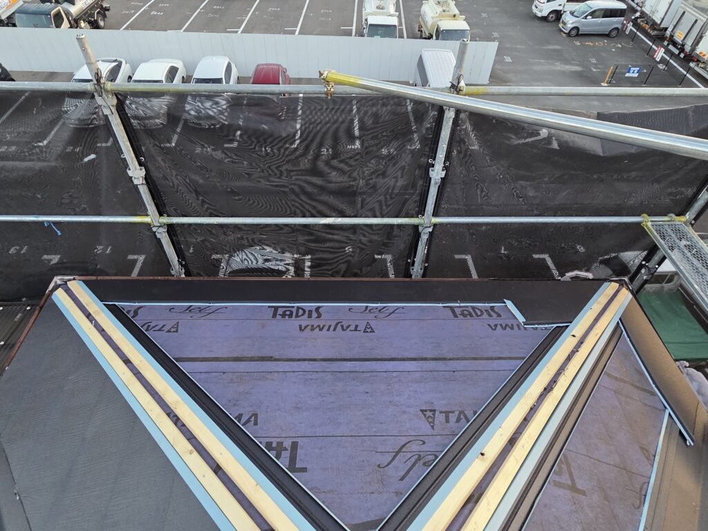 さらに材料(スーパーガルテクト)を荷揚げして、風で飛ばないようにしっかりと養生しながら作業をします。